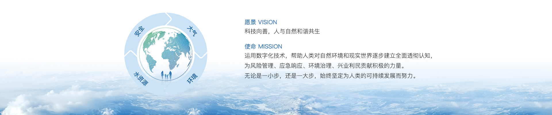 专业与创新、尊重与沟通、实现双赢、超越期望是我们的价值观。科技向善,人与自然和谐共生是我们的愿景。我们的使命是运用数字化技术,帮助人类对自然环境和现实世界逐步建立全面透彻认知,为风险管理、应急响应、环境治理、兴业利民贡献积极的力量。无论是一小步,还是一大步,始终坚定为人类的可持续发展而努力。